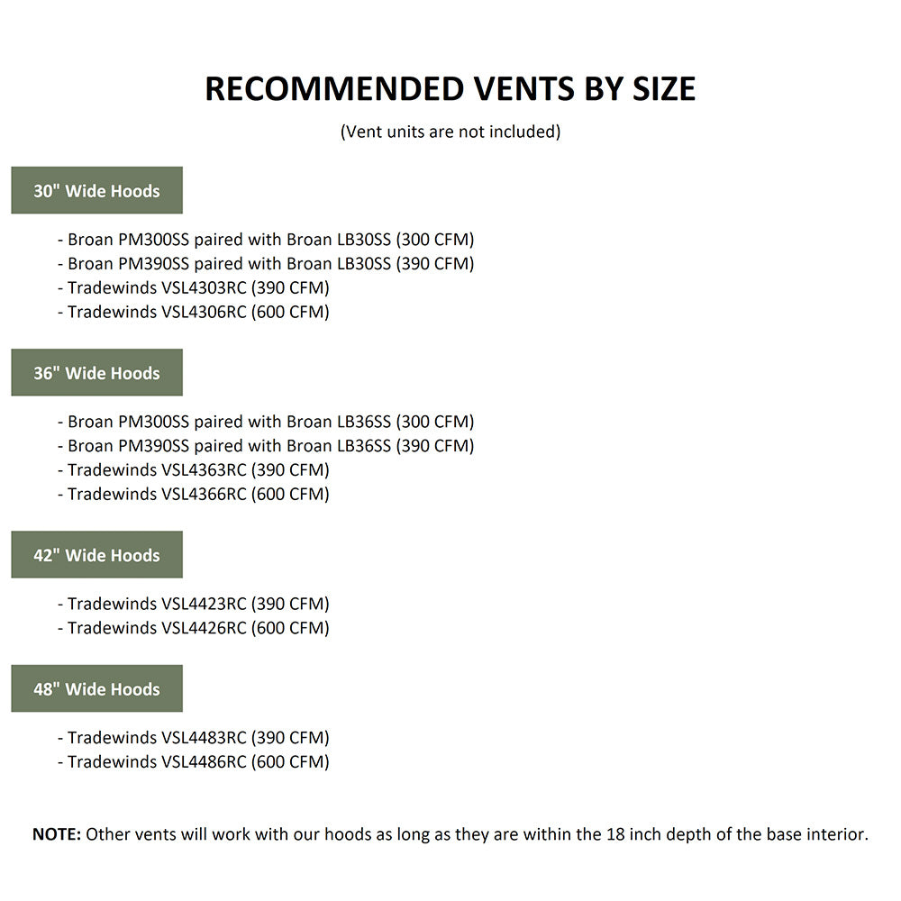 - Broan PM300SS paired with Broan LB36SS (300 CFM)
