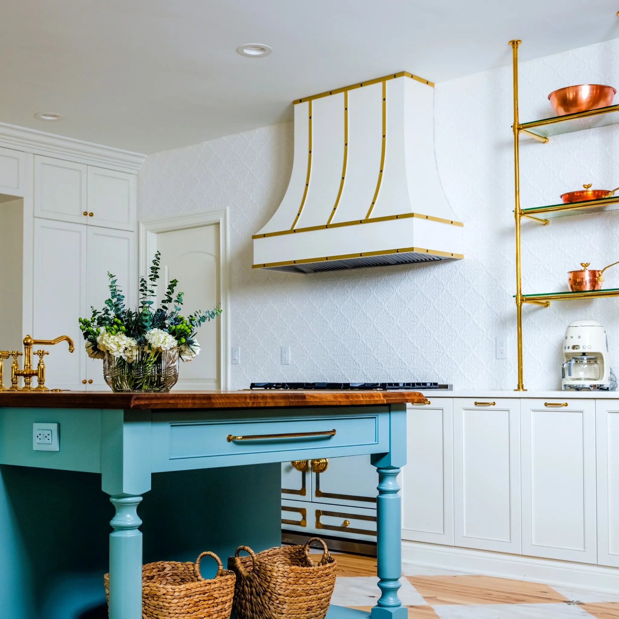 Made from solid plywood, maple veneer and decorated with brass strapping and buttons, this handcrafted wood range hood has a simplified installation and inspection process for ease of use. The two-piece design allows for the base of the hood to be easily mounted to the wall. Once the base is in place, the ventilation can be installed and then the top can be placed onto the base to complete your custom range hood. Before securing the top, inspections can be easily done by removing the top to review the ventilation until everything is 100% connected and in place.