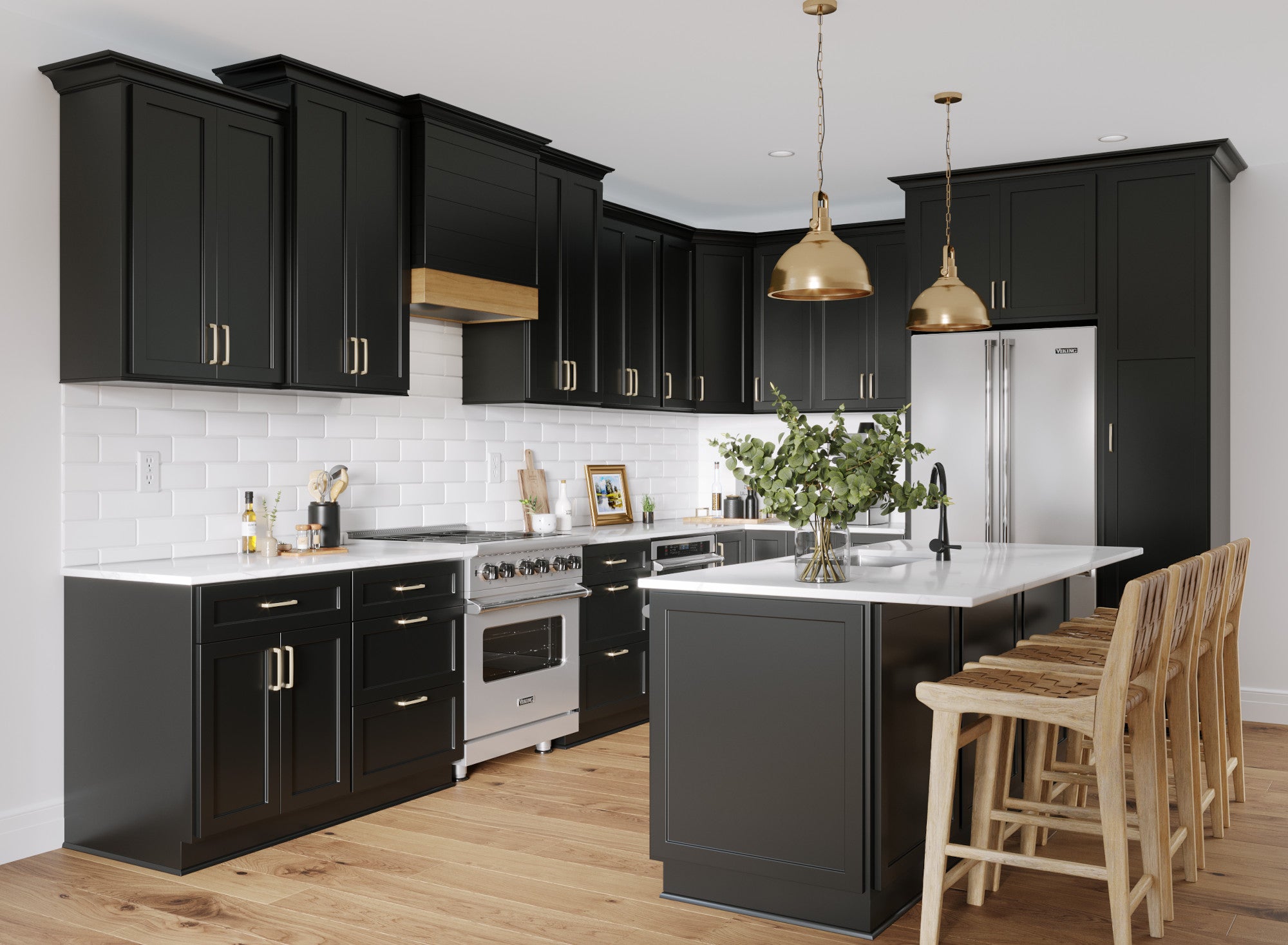 Our black stained shaker kitchen cabinets provide a bold and dramatic statement, adding a touch of modern sophistication to any kitchen design. The subtle but rich, dark woodgrain showing beneath the stain contrasts beautifully with other elements in the space, creating a sleek and stylish atmosphere with a contemporary edge.