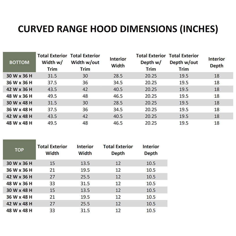 Wood Range Hood With Curved Front and Decorative Trim - 30" 36" 42" 48" 54" and 60" Widths Available